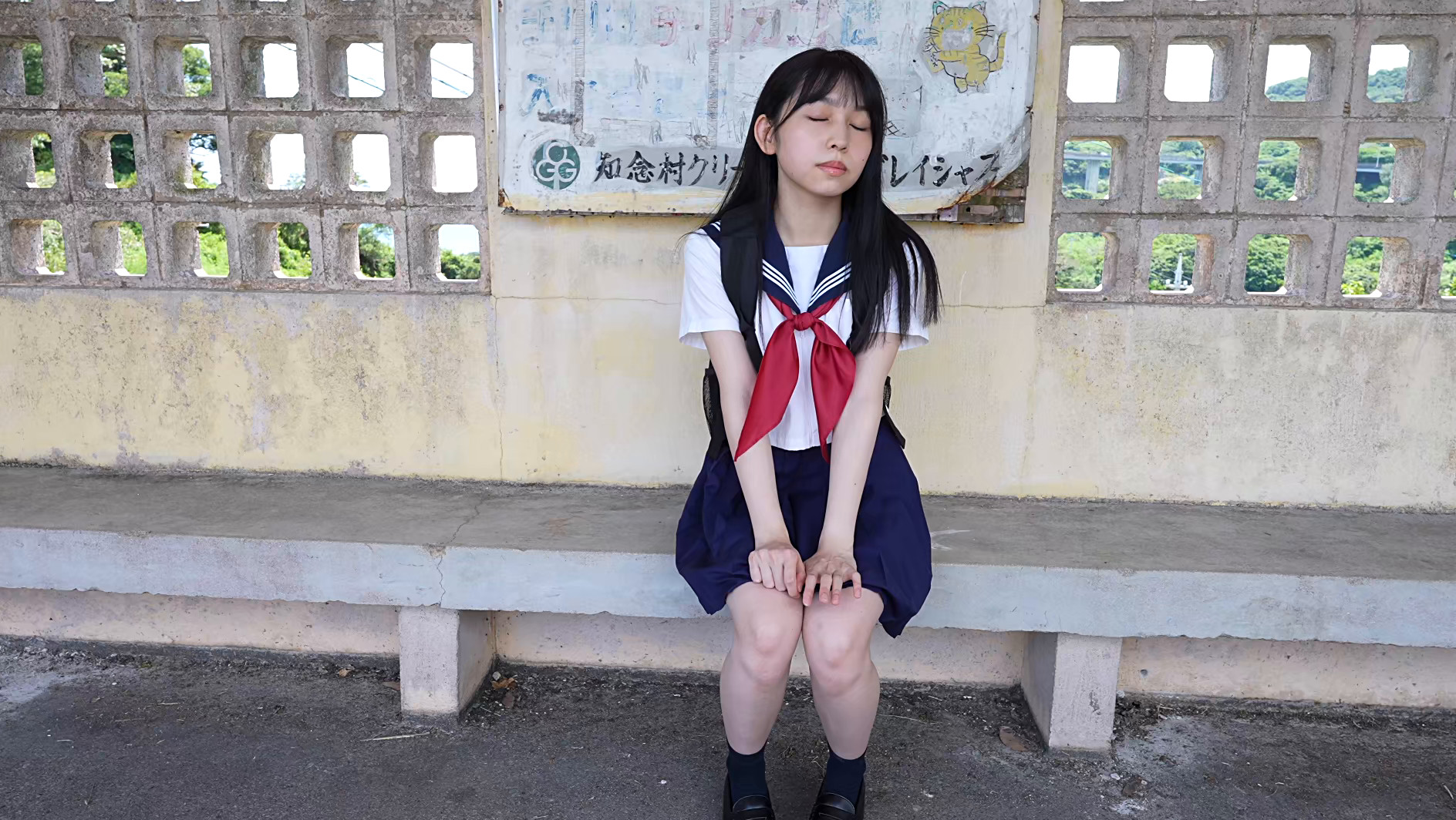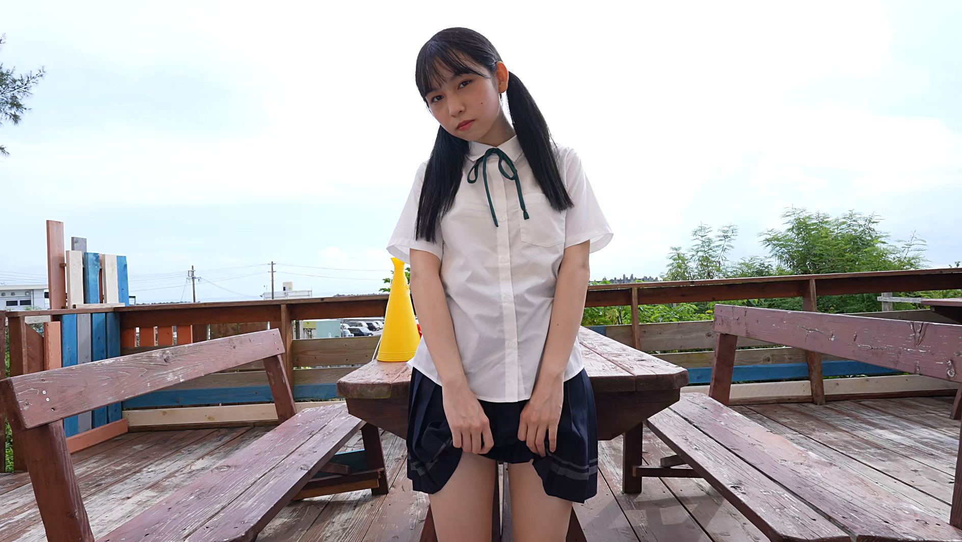 早川真由ちゃんが制服風の衣装で登場。緑が生い茂るロケーションで制服衣装の胸元をはだけてビキニのブラ見せやスカートをめくり上げてパンチラする、ソフトテイストの野外露出的演出。