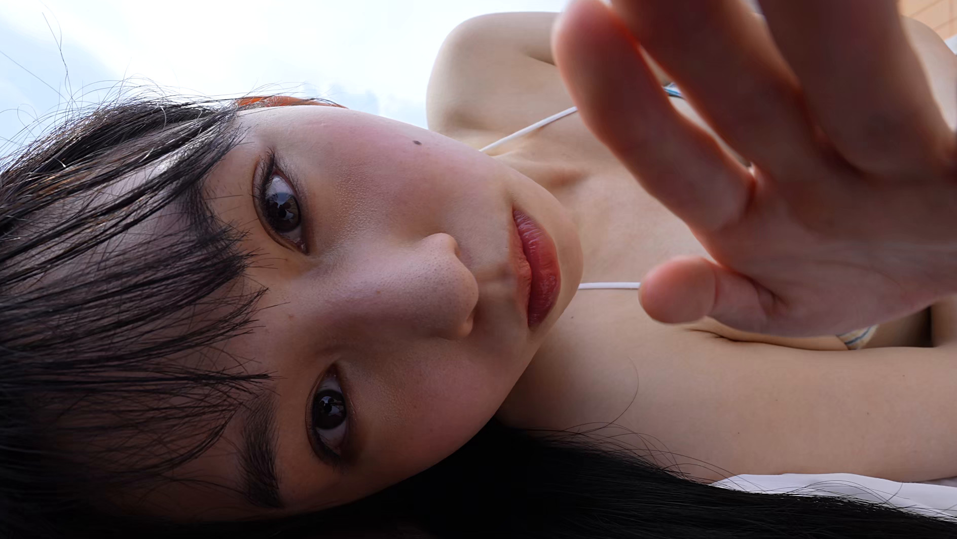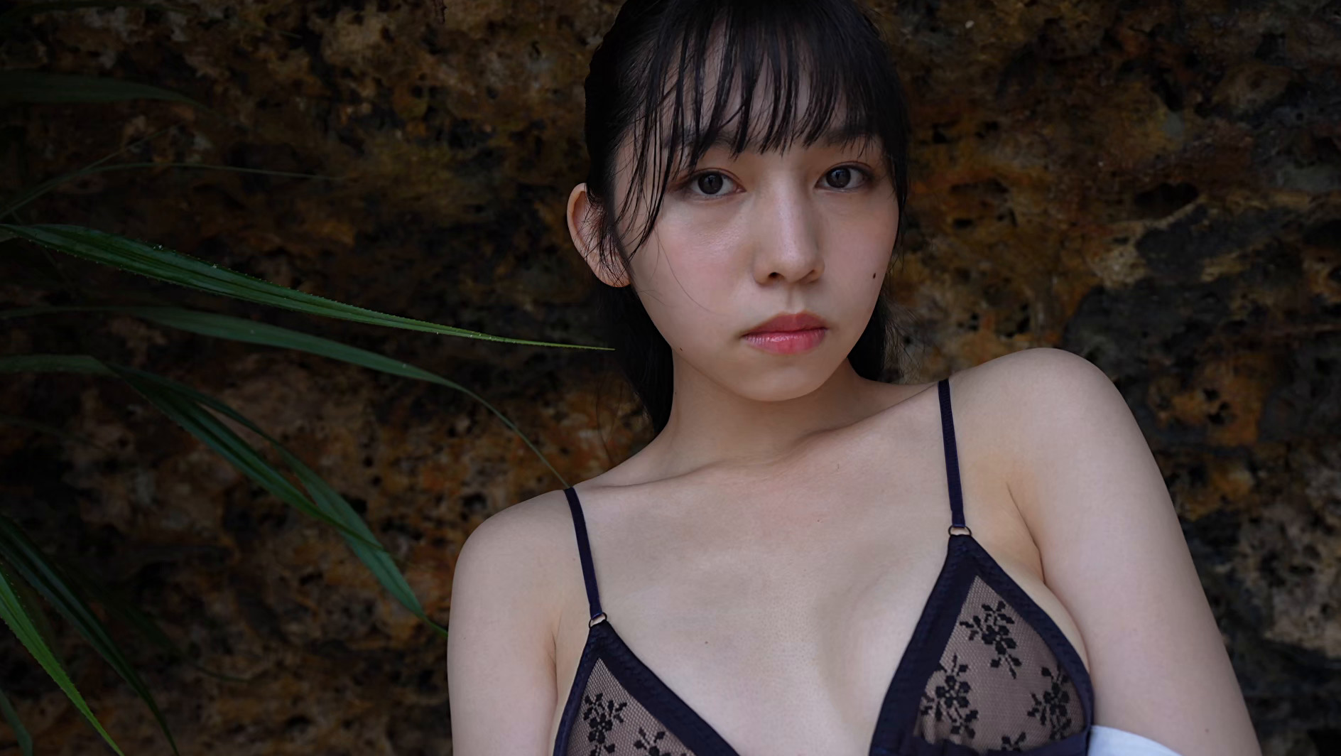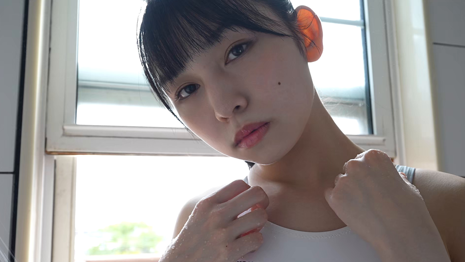 肩、胸元、美脚を洗うセルフ洗体で清楚な色気あふれるスレンダー美ボディを見せ、時折カメラに甘い視線を投げる。ベージュのバンドゥビキニが、肌に近い色味で「透け感」を演出し、84cmのバストラインが際立つ。