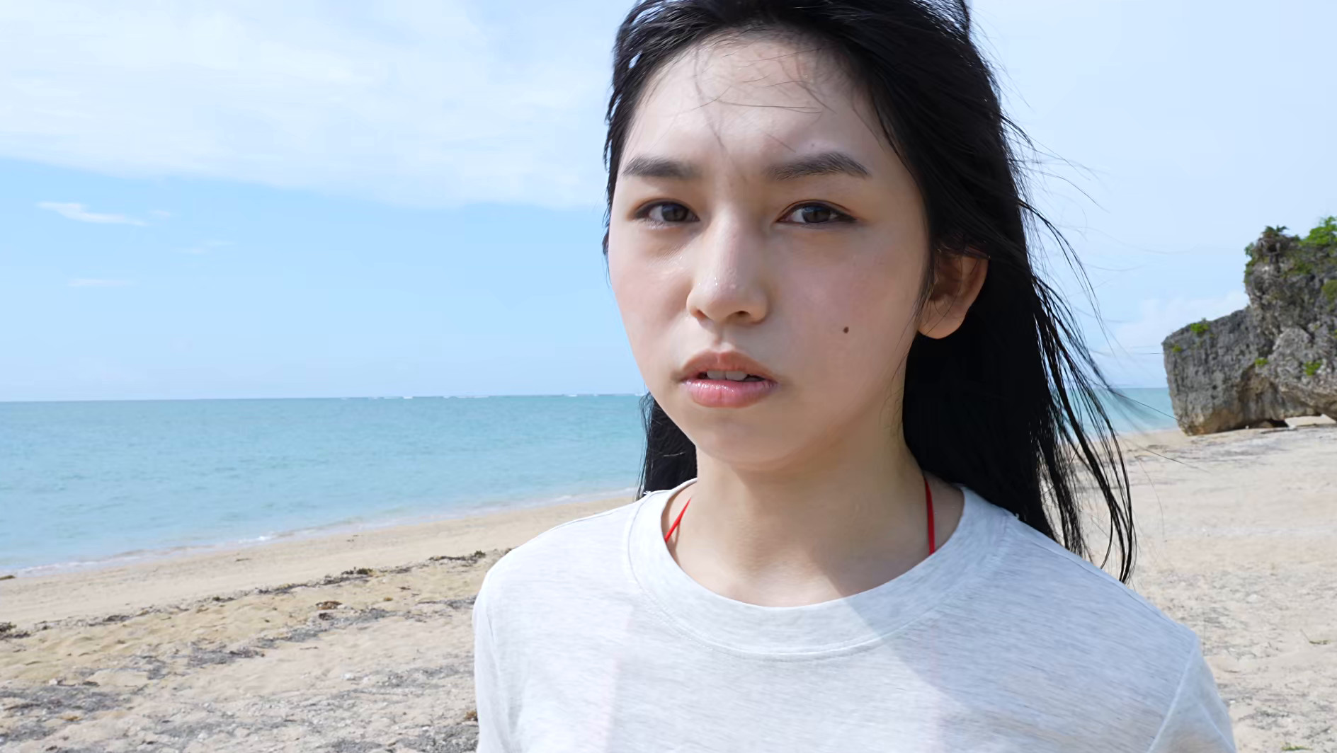 早川真由ちゃんの21歳らしいフレッシュな表情が際立ち、現役アイドルの清楚なルックスと水着グラビアの大胆な露出のギャップで魅せるシーン。