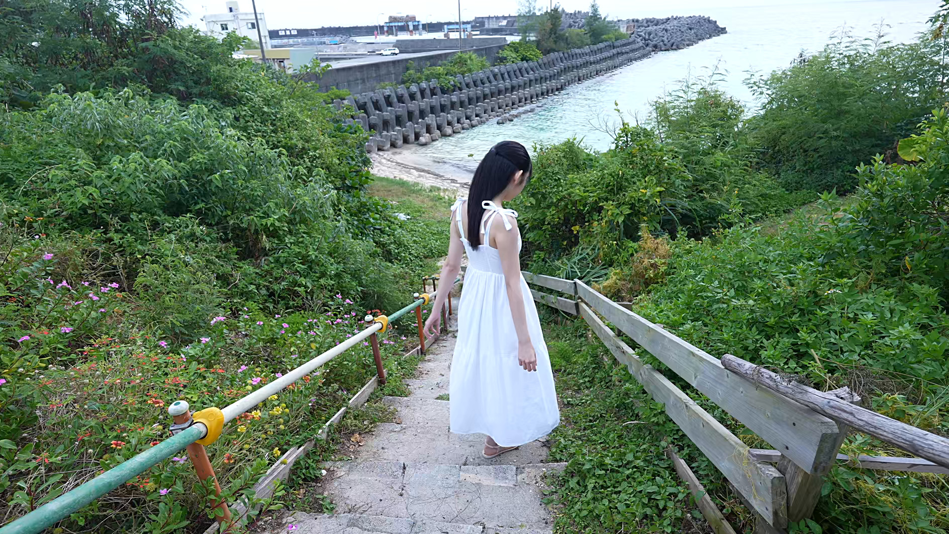 波打ち際で軽く水をかけて遊び、笑顔で視聴者(恋人役)に話しかけるようなカメラ目線。砂浜遊び後 屋根の下のベンチで「背中塗って」と頼まれ、恋人役がビキニ姿の早川真由ちゃんのスレンダー美ボディに日焼け止めクリームを塗るシーンへ。