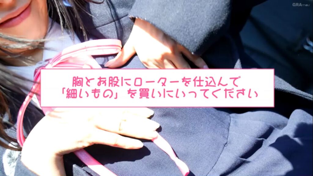 星乃なぎさちゃんが制服コスプレでおっぱいと股間に遠隔ローターを仕込まれた状態で買い物にイカされちゃう、"えちえちお遣い"第二弾シーン。