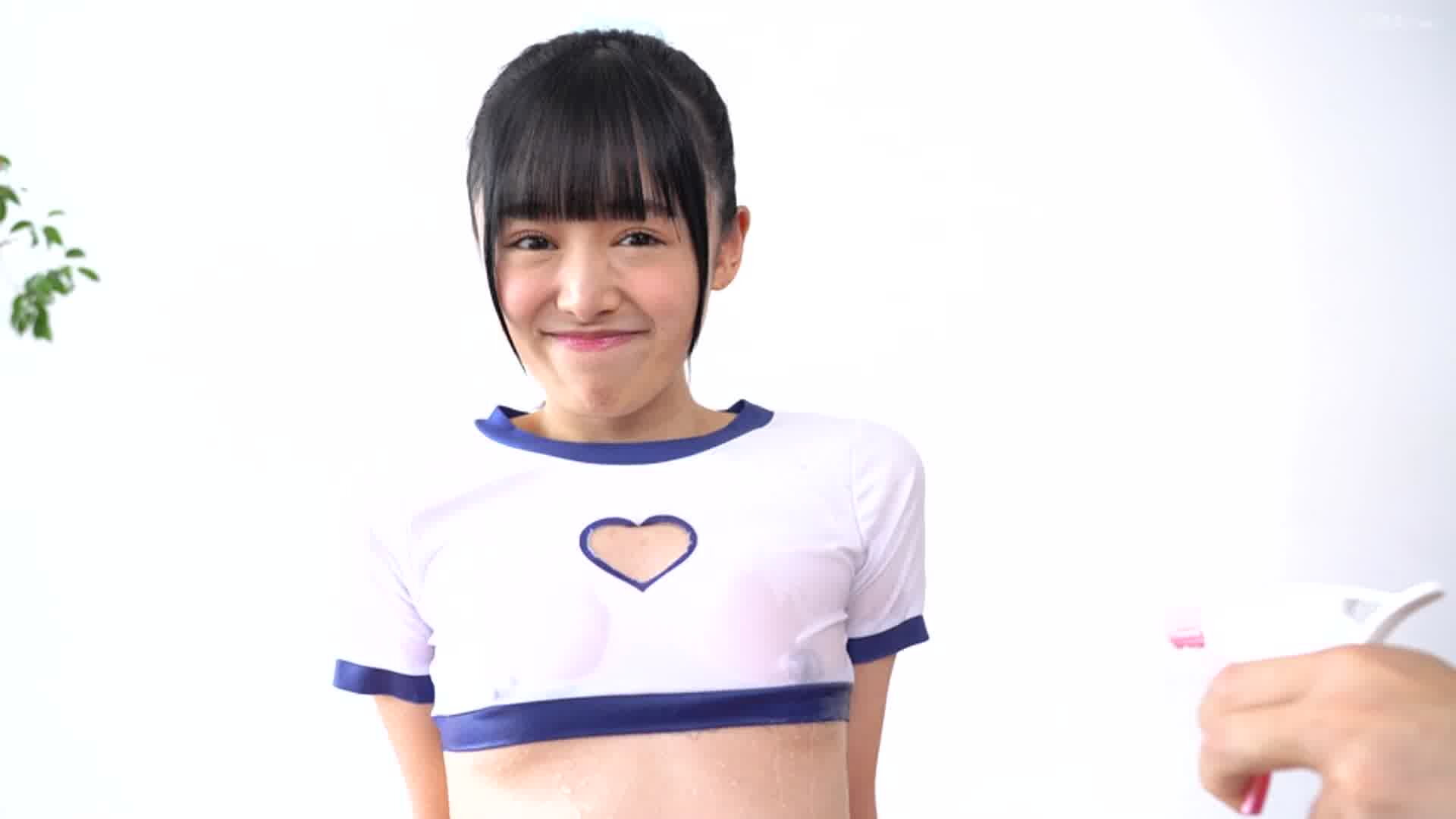 丈が短すぎてちっぱいがハミ出しちゃいそうな体操着風衣装の水嶋柚月ちゃんが、霧吹きイタズラで透け乳首にされたりバイブ責めされて思わず潮吹きイキしちゃうえちえち運動シーン。