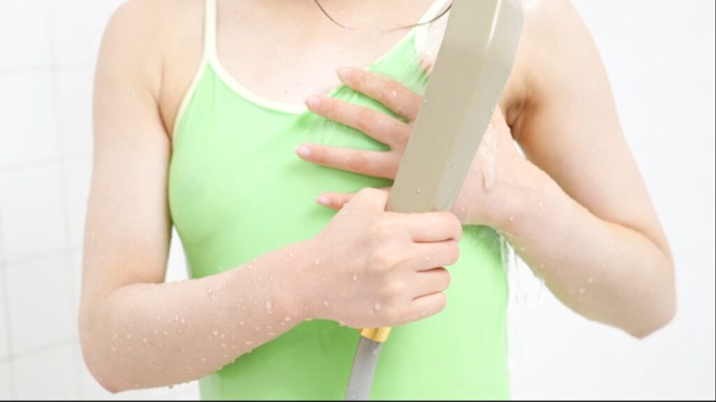 お風呂上がりに保湿ケアをする西本風香ちゃん。セルフで腋の下やおっぱい、股間にクリームを塗り次第にえっちな吐息が漏れ出ちゃう風香ちゃん(疑似オナニー風の演出)。