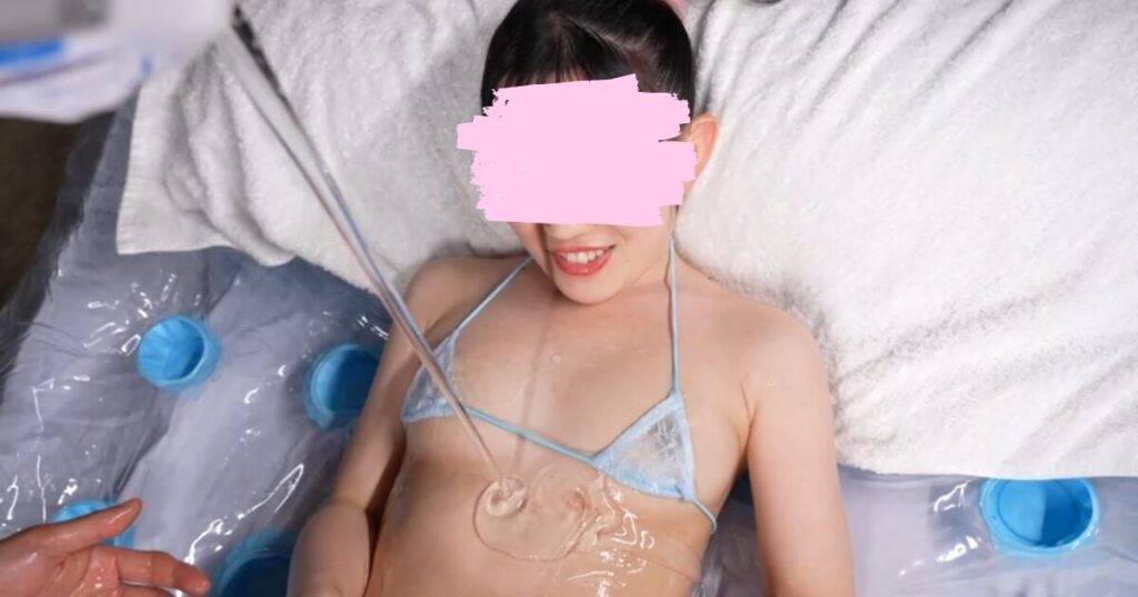 透け透け極小ビキニの櫻井小春ちゃんがぬるぬるローションを全身にたっぷりぶっかけられ、ぬるぬるエロマッサージで敏感ボディを揉みほぐされイカされちゃうシーン。
